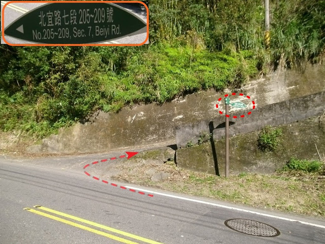 往回走約150公尺右側斜坡路,路標【北宜路七段205~209號】由此進入→經過205號民宅右側、